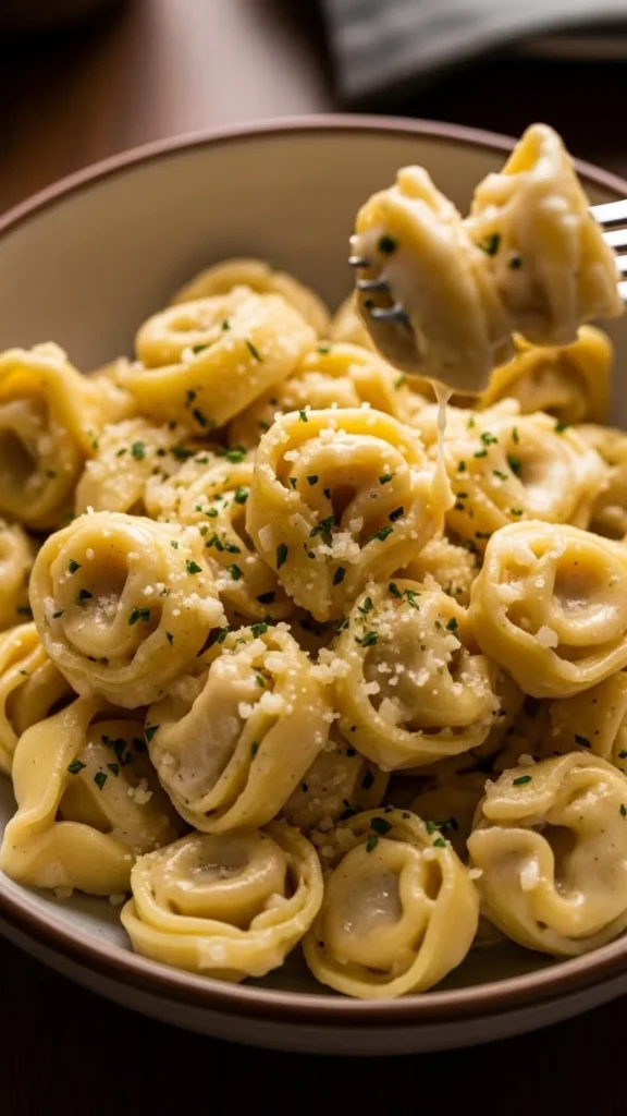 Tortellini adds extra richness because the pasta is already filled with cheese. The garlic cream sauce turns it into a comforting yet elegant meal.