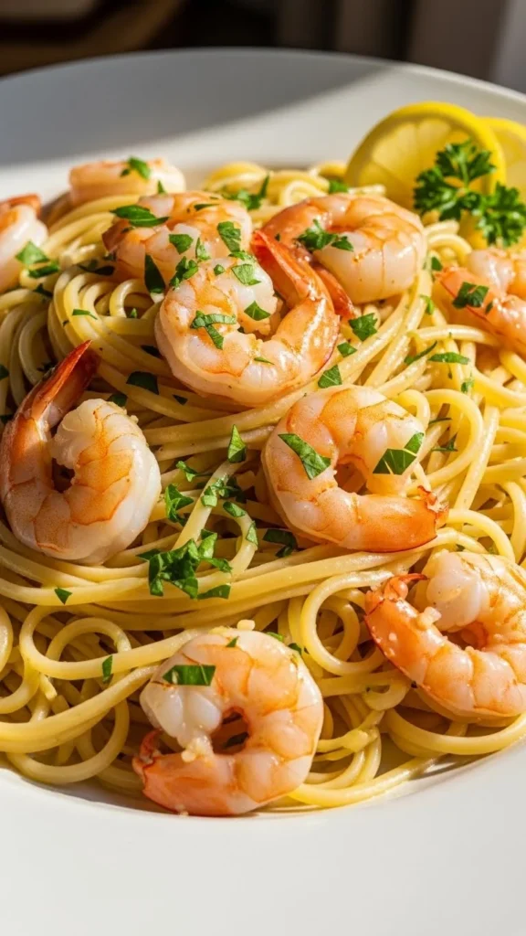 Serve immediately so the shrimp stays tender. Keep garnishes simple to let the lemon and garlic stand out. A wedge of lemon on the plate works well. This dish pairs gently with white wine or sparkling water.