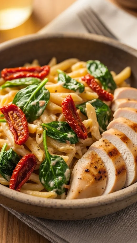 This pasta combines cream sauce with sun dried tomatoes and spinach, which is a recurring pairing in high ranking pasta guides. The sauce is flavorful without being too heavy, and chicken adds a comforting protein. It is cozy, colorful, and very satisfying.