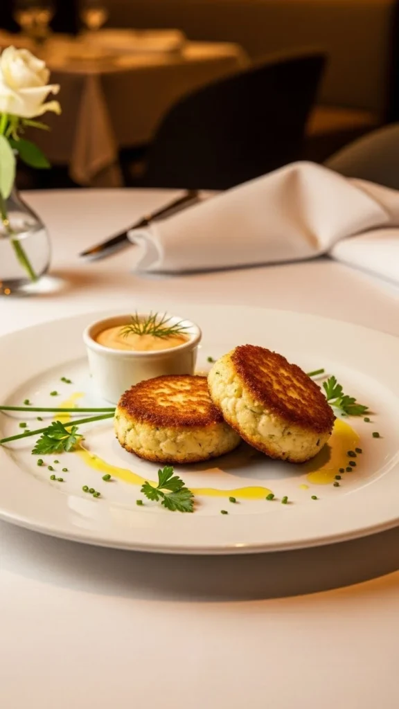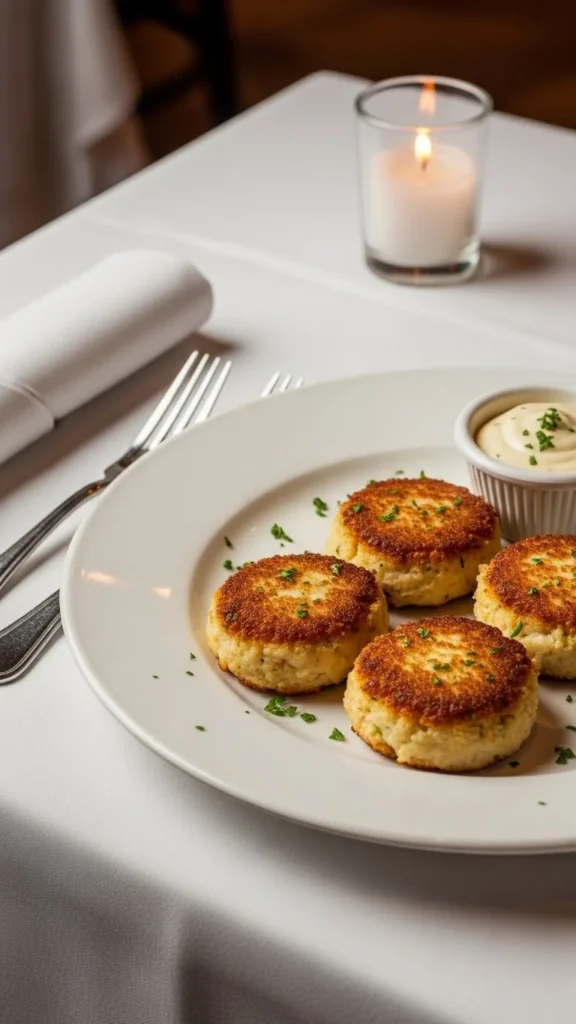 Crab cakes feel refined because they combine delicate crab meat with a lightly crisp golden crust. The inside stays soft and sweet, while the lemon aioli adds brightness that keeps the flavors balanced instead of heavy. This is the kind of starter you would expect in a fine seafood restaurant, but it works beautifully at home for a romantic dinner.