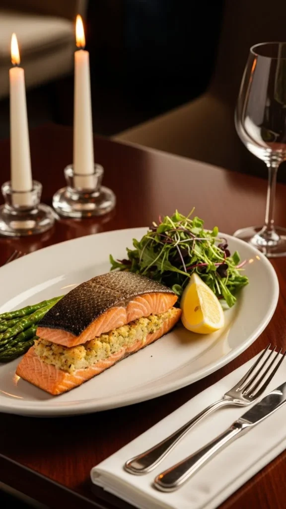 This recipe pairs flaky salmon with a sweet crab stuffing for an indulgent main course. It has the richness you expect from restaurant seafood, yet it remains simple enough to prepare at home.
