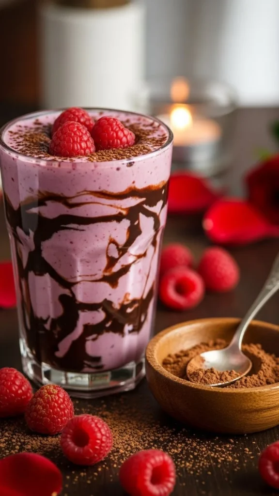 This smoothie pairs raspberries with cocoa powder to create a flavor similar to chocolate raspberry truffles. The raspberries add bright sweetness, while the cocoa provides richness, making the smoothie taste indulgent but still fresh.