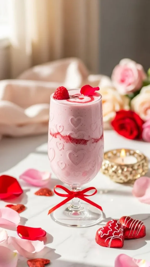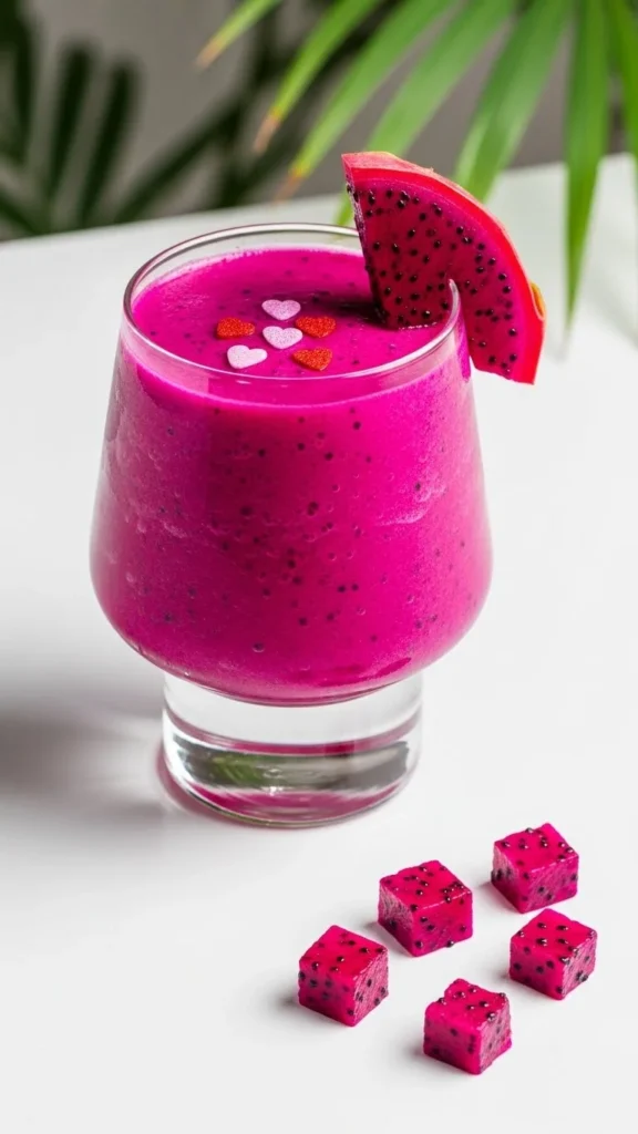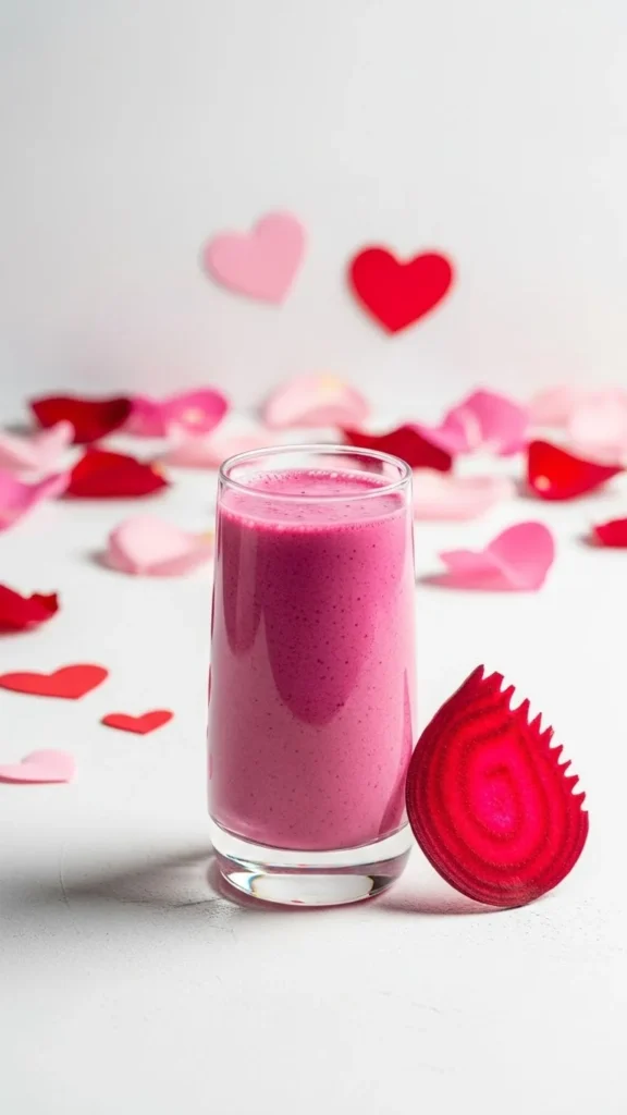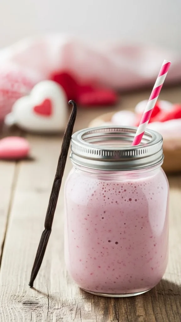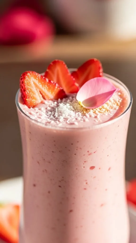 Serve in a clear glass so the pink shade is visible. Garnish with strawberry slices or coconut flakes to add color and texture, which helps the smoothie look like a romantic treat instead of a basic breakfast drink.