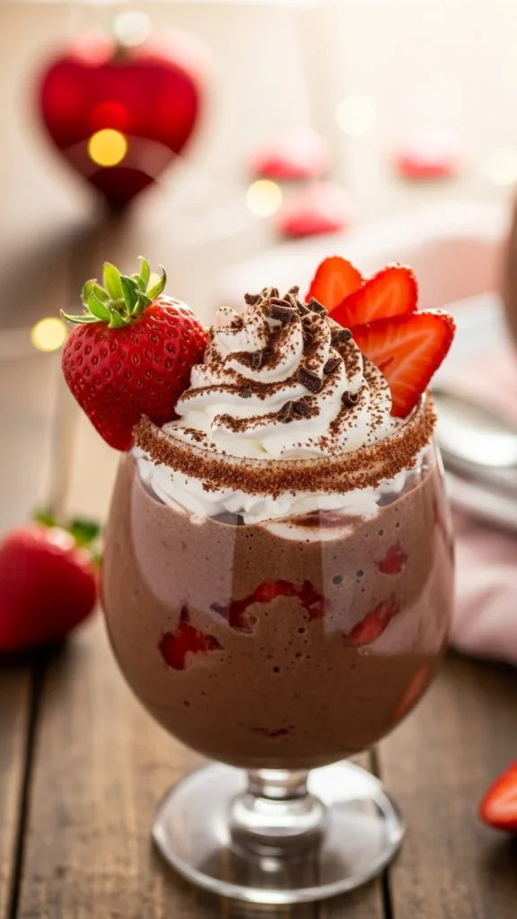 Serve in a dessert style glass or wine glass to give it a romantic touch. A light cocoa sprinkle or a single strawberry garnish helps it feel gourmet and visually appealing.