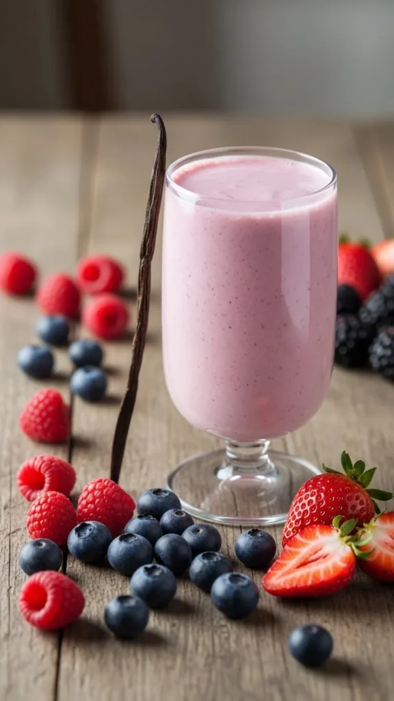 This smoothie blends mixed berries with vanilla to create a creamy, sweet, and slightly tart flavor that feels comforting and romantic. The vanilla adds warmth, giving it a dessert-like quality.
