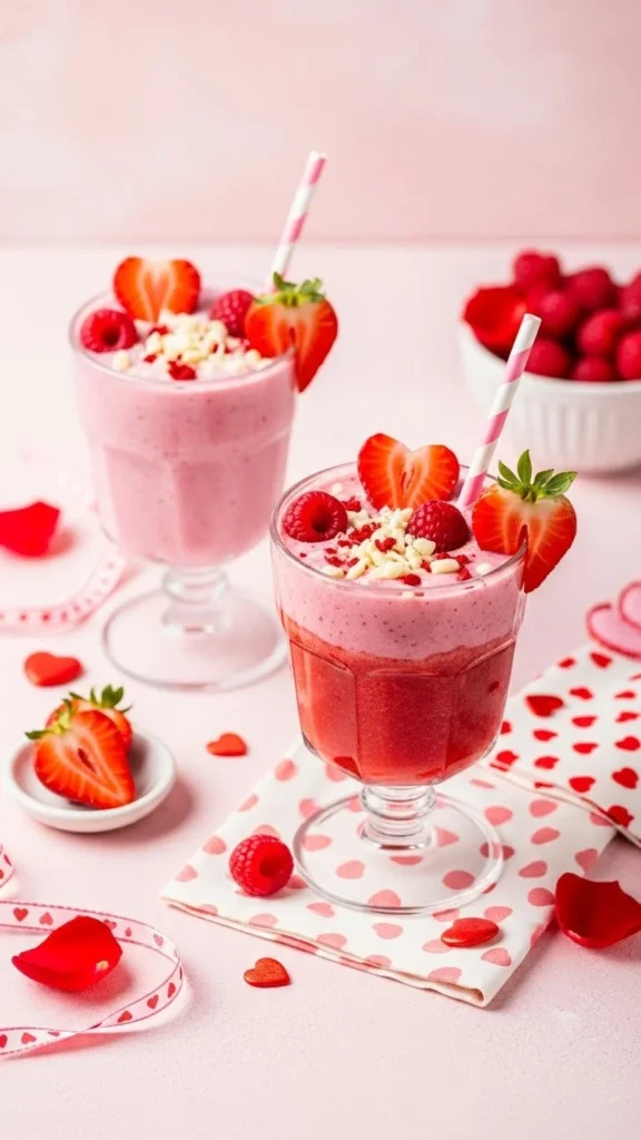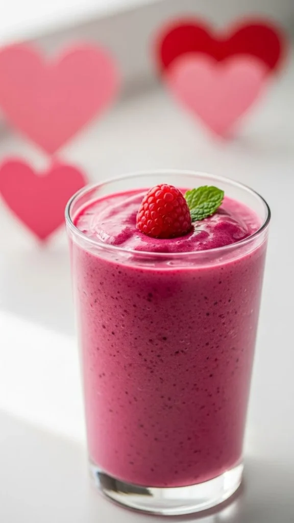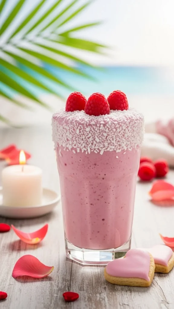 This smoothie blends raspberries with coconut milk to create a creamy, tropical style Valentines drink. The natural berry tartness balances the coconut sweetness, making it taste like a refreshing dessert treat.