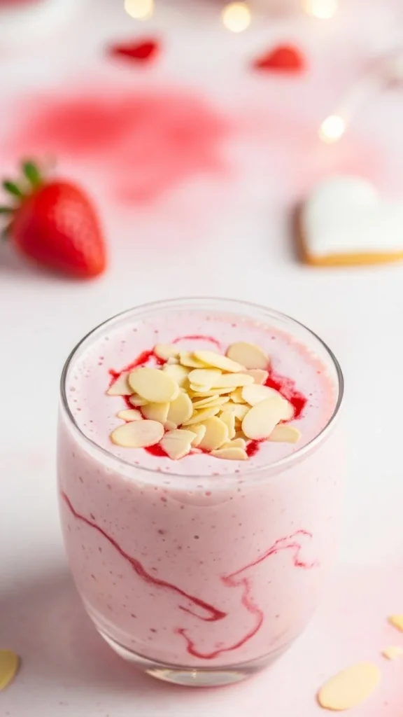 This smoothie blends strawberries with almond milk and a hint of almond flavor, creating a nutty sweet taste often compared to almond desserts. It feels creamy and smooth while staying dairy free, making it a popular option in Valentines smoothie roundups.