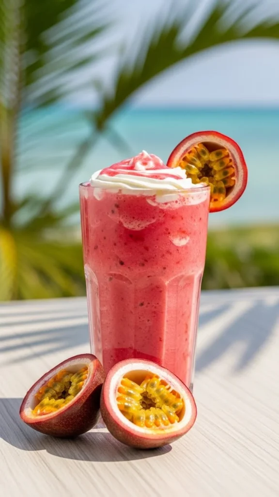 This smoothie uses passion fruit blended with berries or banana to create a tropical sweet tart flavor. Passion fruit is often highlighted in romantic themed recipes because of its bright, fragrant taste and exotic feel.