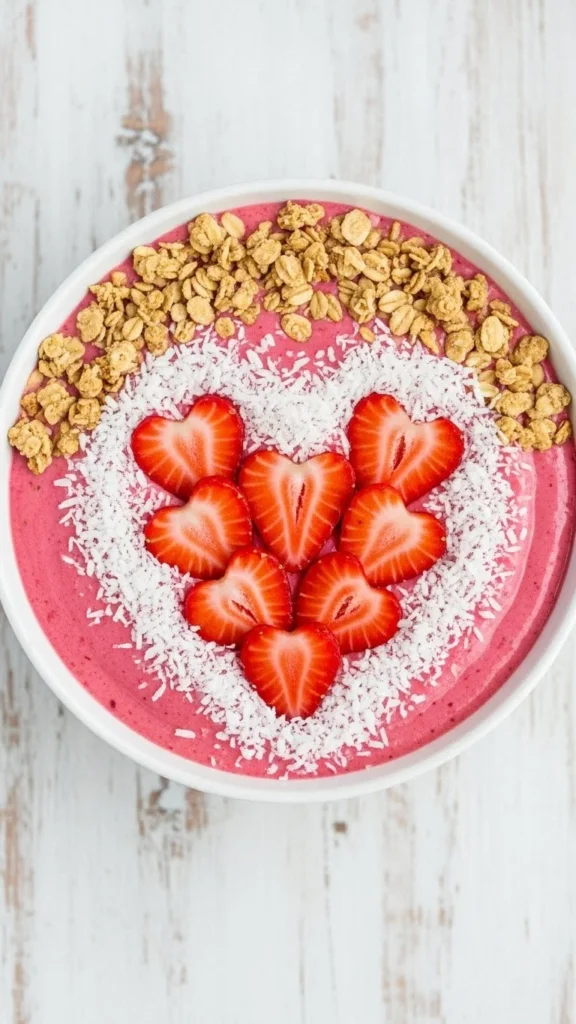 This smoothie is served as a thick bowl instead of a drink, creating a dessert-like presentation that looks beautiful and colorful. It stays popular in Valentines inspired food guides because it feels playful and decorative.