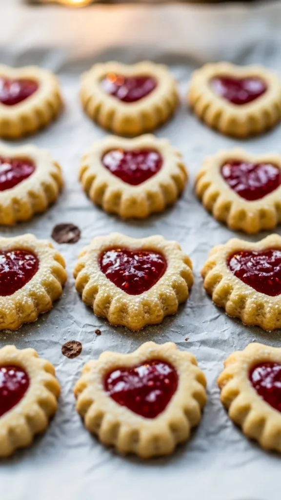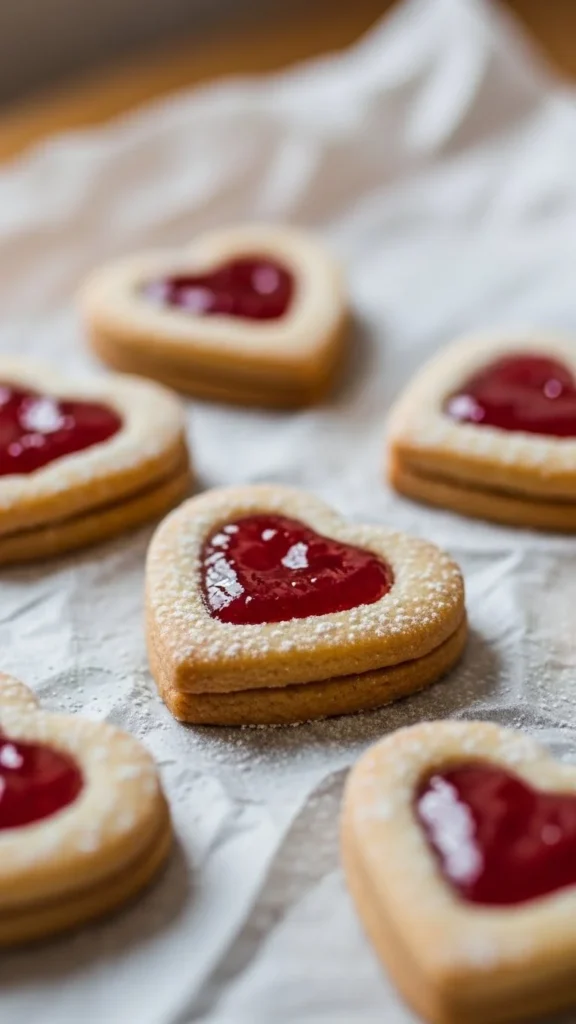 Heart shaped jam cookies are popular because the filling creates a sweet jewel-like center that looks charming and gift worthy. They offer a nostalgic, homemade Valentine dessert style.