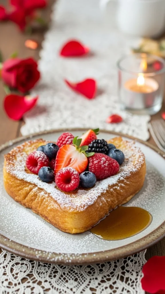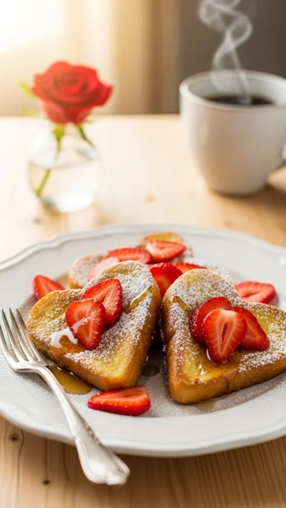 French toast becomes extra charming when cut into heart shapes. The custard soaked bread gives a bakery style texture while the heart cutout adds a romantic or family friendly Valentine touch.