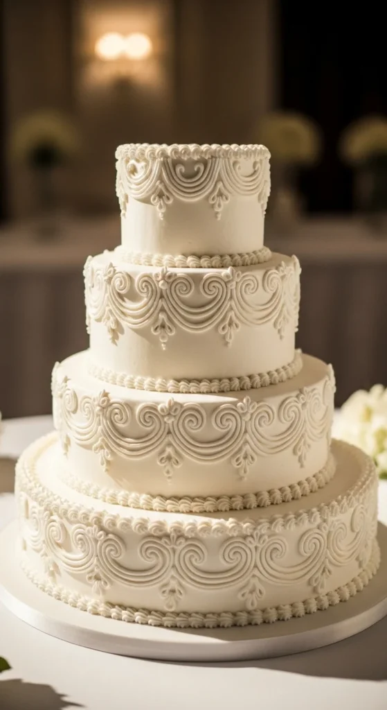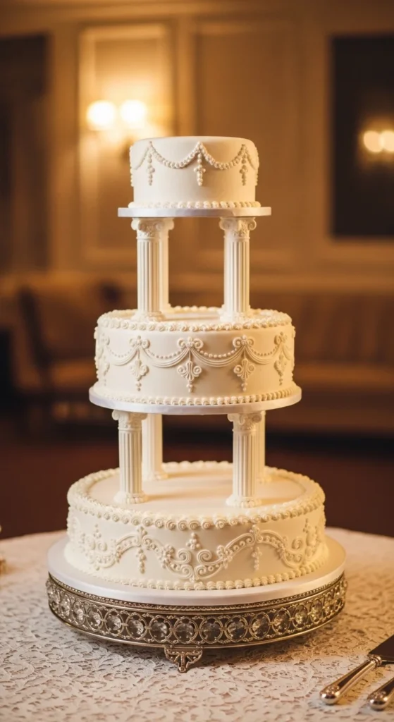 This cake brings back a classic vintage style with elevated tiers supported by pillars and detailed piping. It feels dramatic and decorative, making it ideal for traditional or nostalgic wedding themes. The structure itself becomes a key part of the design.