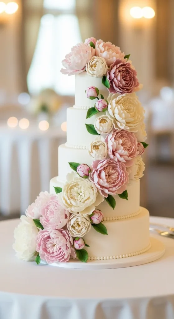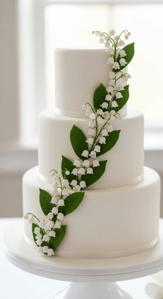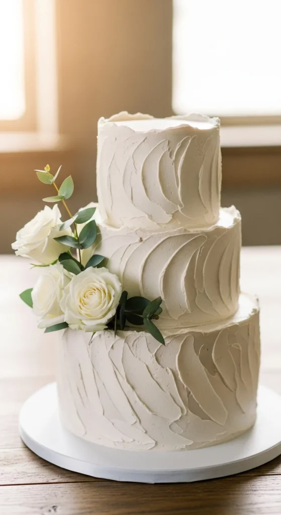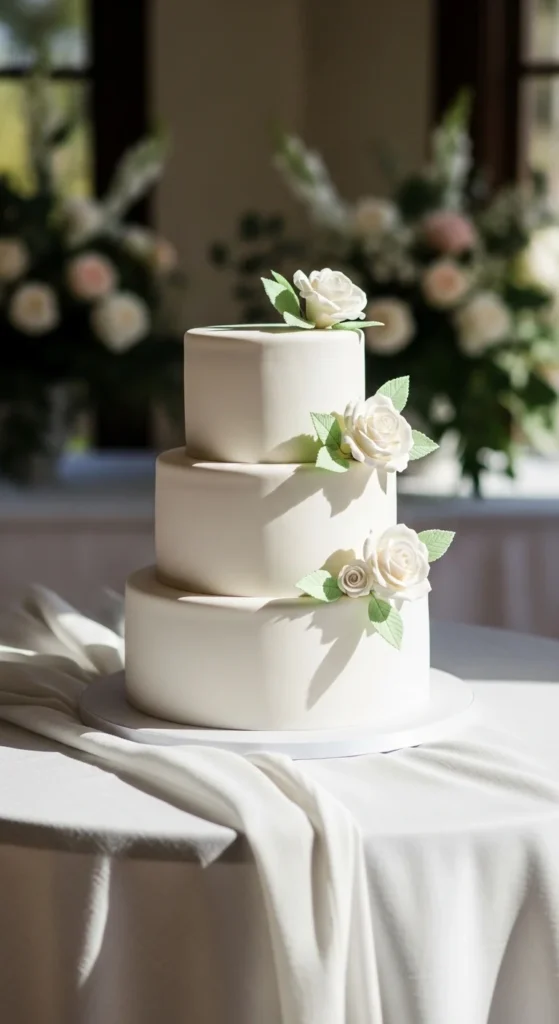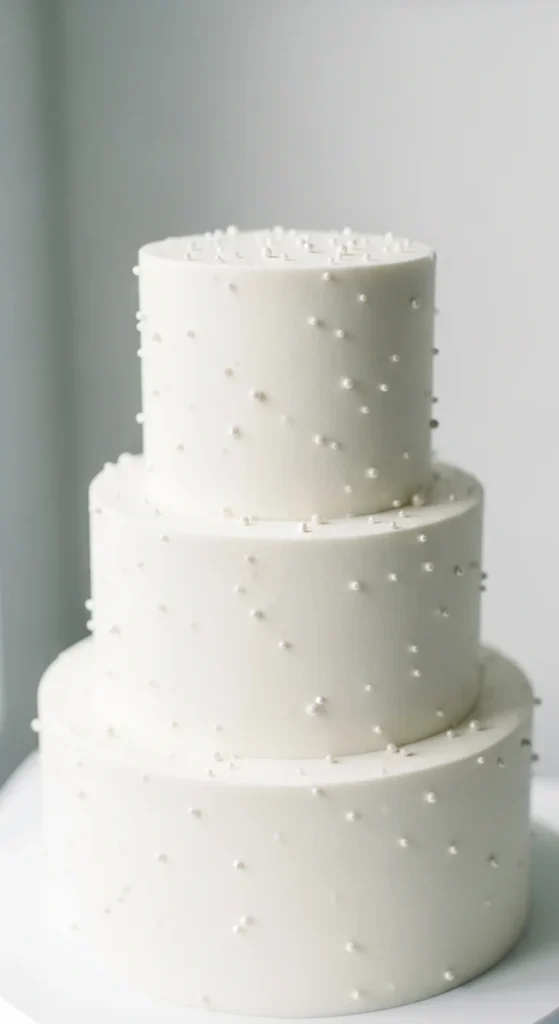 This cake keeps a classic white base but adds a soft pearlescent finish that reflects light subtly. The result is a clean design with a touch of luxury, making it suitable for both modern and traditional weddings.