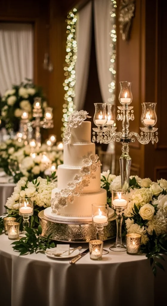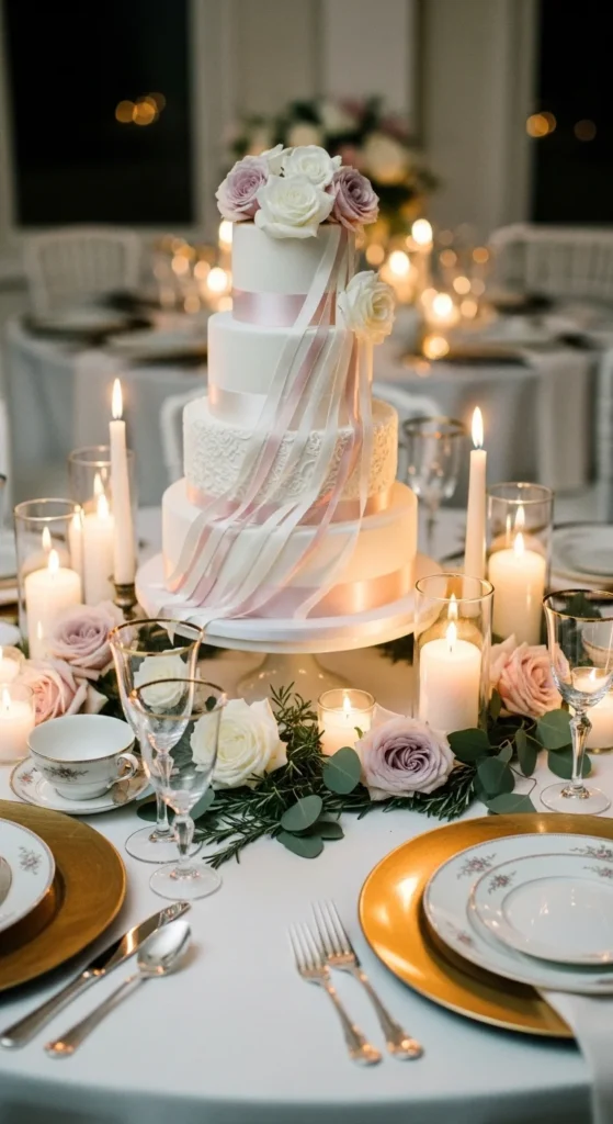 This design focuses not just on the cake but the entire presentation around it. Ribbons wrap around the tiers while candles create a warm, glowing setup. It turns the cake into part of a larger styled display.