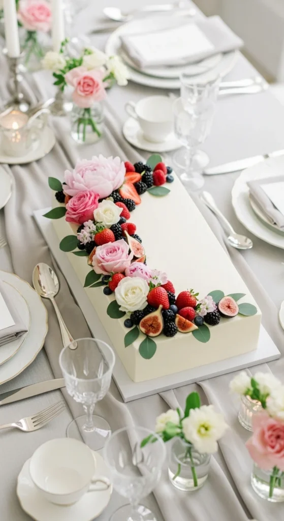This cake breaks away from traditional shapes by using a long rectangular format. It’s practical for serving larger groups while still looking stylish and modern. The length allows for creative decoration without stacking multiple tiers.