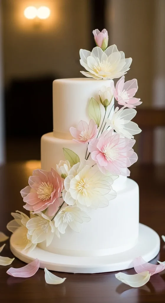 This cake uses lightweight wafer paper to create soft, almost translucent flowers. The petals look delicate and airy, giving the cake a refined and artistic feel without adding weight.