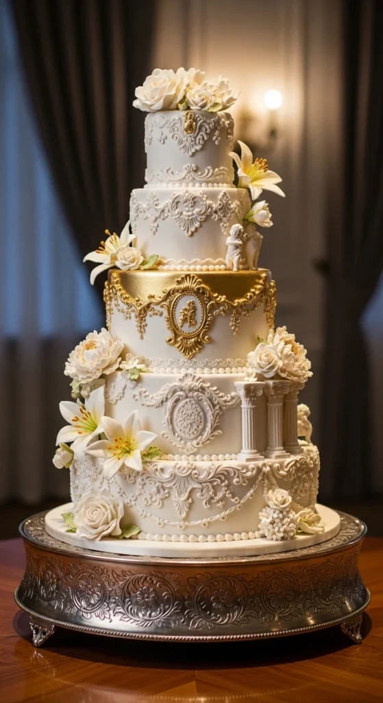 This cake is detailed and dramatic, featuring sculpted patterns inspired by classical designs. It often includes raised textures and ornate elements that give it a luxurious, almost architectural feel.