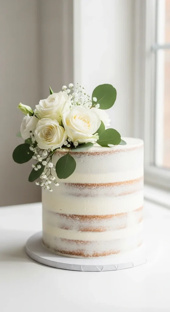 This cake keeps things simple by showing the layers through a thin coating of frosting. It feels natural, light, and slightly rustic while still looking elegant when styled properly. It’s a great option for outdoor or garden-style weddings.