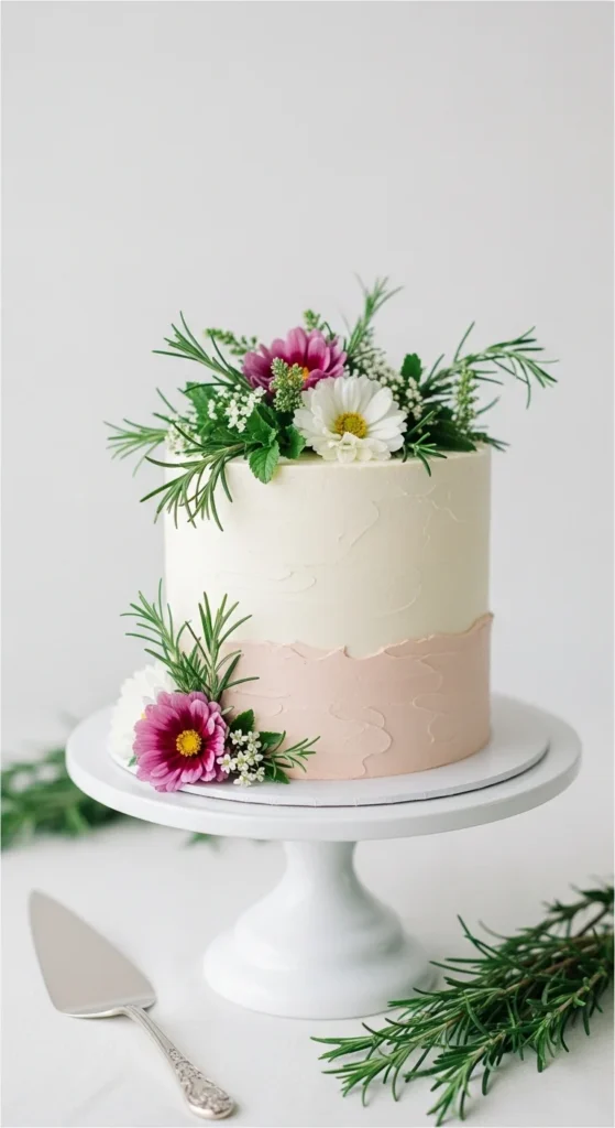 This cake combines herbs and edible flowers to create a fresh and slightly unique design. The greenery adds texture while keeping the look clean and modern. It’s perfect for couples who want something subtle but different.