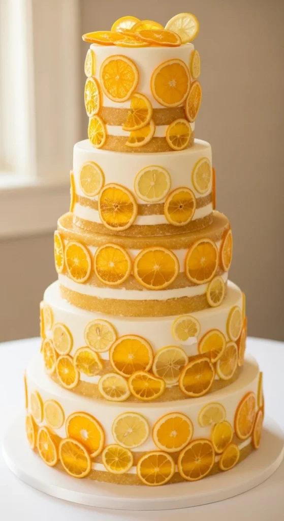 This cake uses candied citrus to create a bright, slightly glossy finish that feels refined but different. The translucent slices add depth and texture while keeping the overall design clean. It works especially well for modern, summer, or destination weddings.