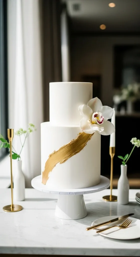 This cake focuses on one large tier instead of multiple stacked layers, making it bold and modern. The design relies on clean structure and one strong decorative element rather than multiple details. It’s easier to handle and works well for smaller or minimalist weddings.