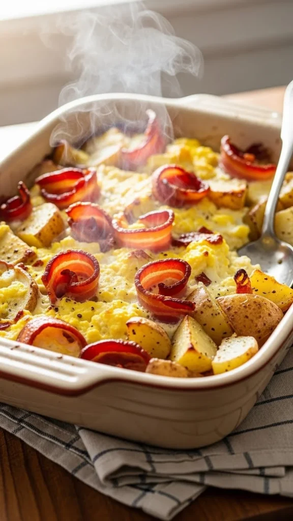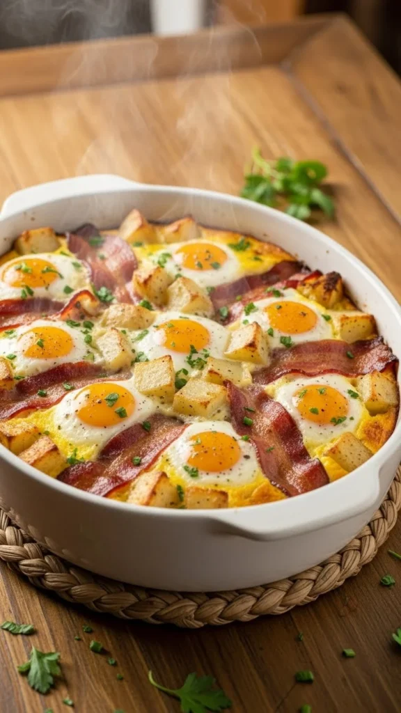 This breakfast casserole is savory, simple, and perfect for winter mornings. The eggs bake into a fluffy layer, while the potatoes and bacon add texture. Great for feeding a full table.