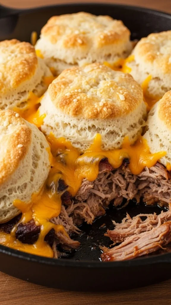 This casserole combines tender pulled pork with a cheesy biscuit topping. The biscuits bake into a warm, fluffy layer while the pork stays juicy underneath. Perfect for big winter gatherings.