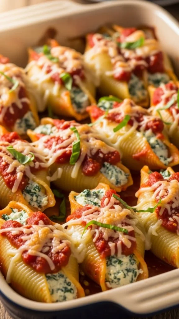 These stuffed shells are creamy inside with rich marinara on top. The spinach brings freshness while the cheese adds warmth. It’s a family-friendly meal with comforting pasta flavors.