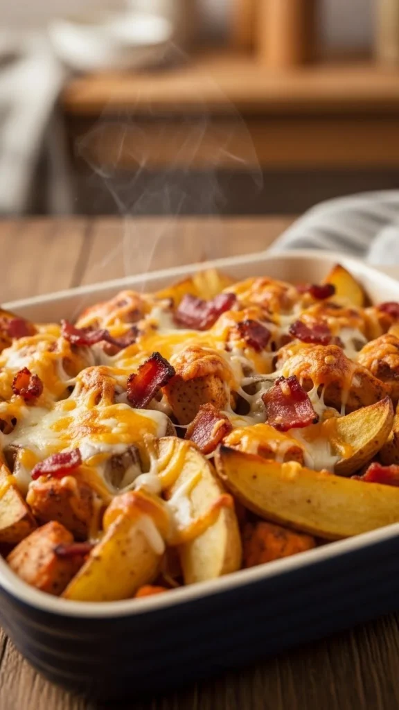 This casserole brings classic baked potato flavors with added chicken for substance. The cheese melts into the potatoes while bacon adds crunch. It feels cozy and filling for winter evenings.