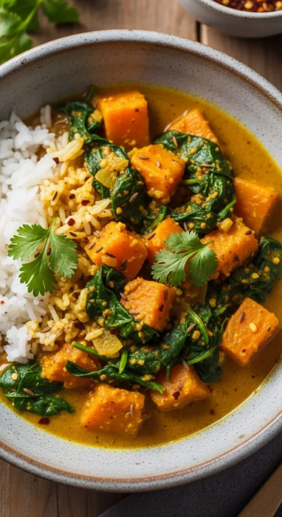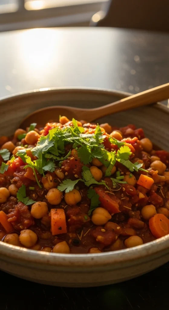 This stew is warm, slightly spiced, and full of comforting flavors that make winter nights feel special. The chickpeas give it heartiness while the tomatoes and carrots add a soft sweetness. The spices create a soothing aroma that fills the whole kitchen. It simmers slowly, allowing all ingredients to blend into a thick, satisfying stew. Serve it with warm flatbread for dipping.
