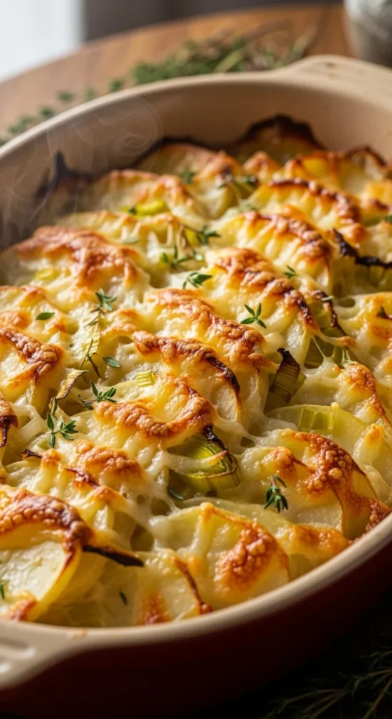 - Layer potatoes, leeks, cheddar, and mozzarella in a baking dish.
