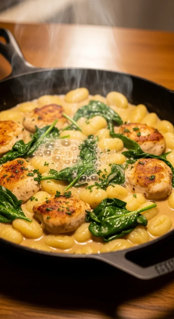 This creamy chicken gnocchi skillet is soft, warm, and comforting exactly what winter dinners call for. The gnocchi become pillowy and tender as it absorbs the creamy sauce. The chicken adds protein while the spinach brings color and freshness. Everything cooks in one pan, making cleanup easy and the flavors deeply blended. It’s rich without feeling too heavy.