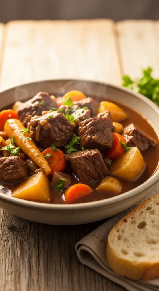 Serve hot in bowls, garnished with fresh parsley. Pair with crusty bread or dinner rolls to soak up the broth. Add a side of green beans or a simple salad for a balanced meal. Keep the stew warm in the slow cooker for seconds or leftovers.