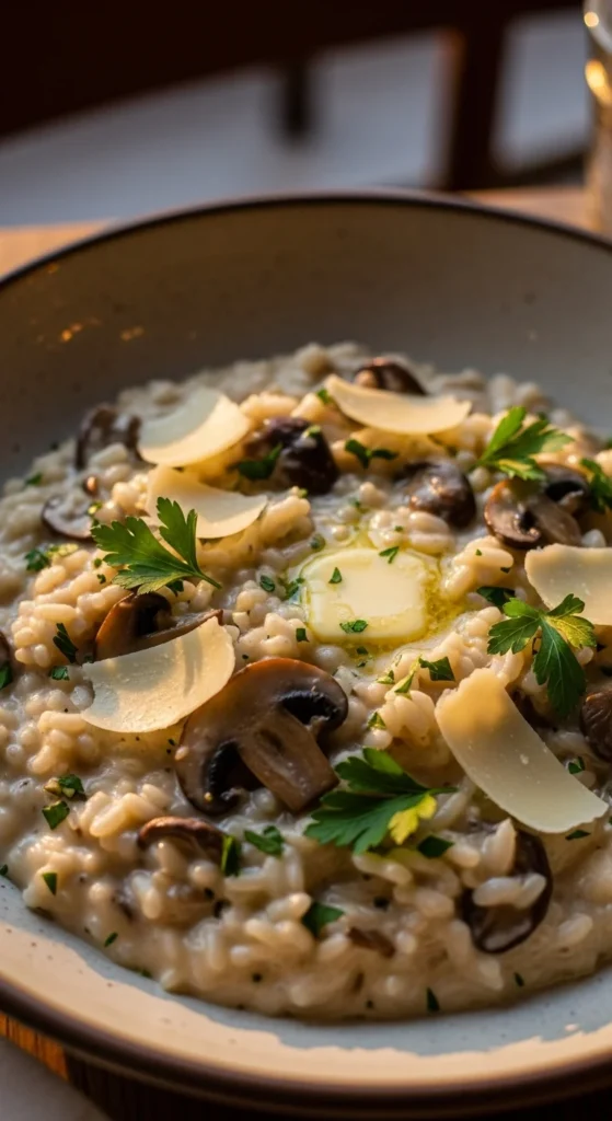 Top with extra mushrooms. Add cracked pepper for contrast. Serve in warm bowls. Garnish with parsley. Pair with grilled chicken or seafood. Add parmesan shavings. Keep warm until serving.