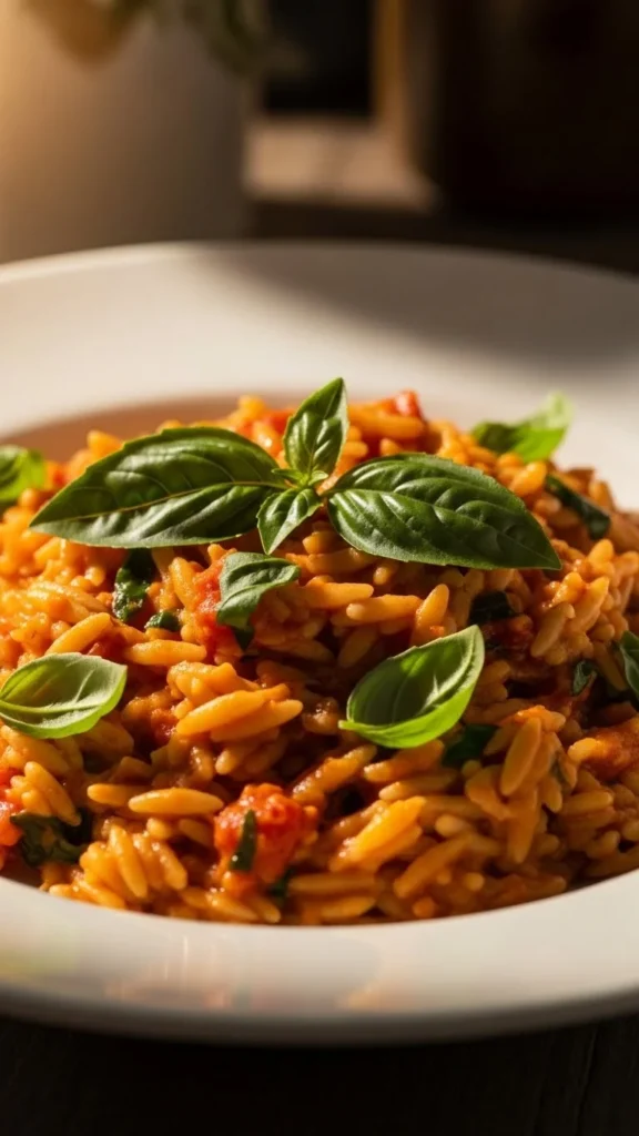This dish cooks into a velvety, smooth pasta with rich tomato flavor. The orzo becomes soft and creamy in minutes. It’s a cozy winter comfort meal with minimal prep.