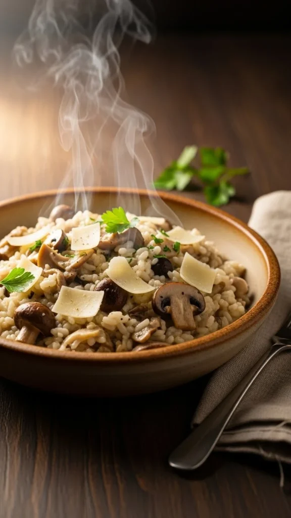 This risotto becomes creamy and tender without constant stirring. The mushrooms add earthy depth that suits winter flavors well. It tastes luxurious but cooks quickly.