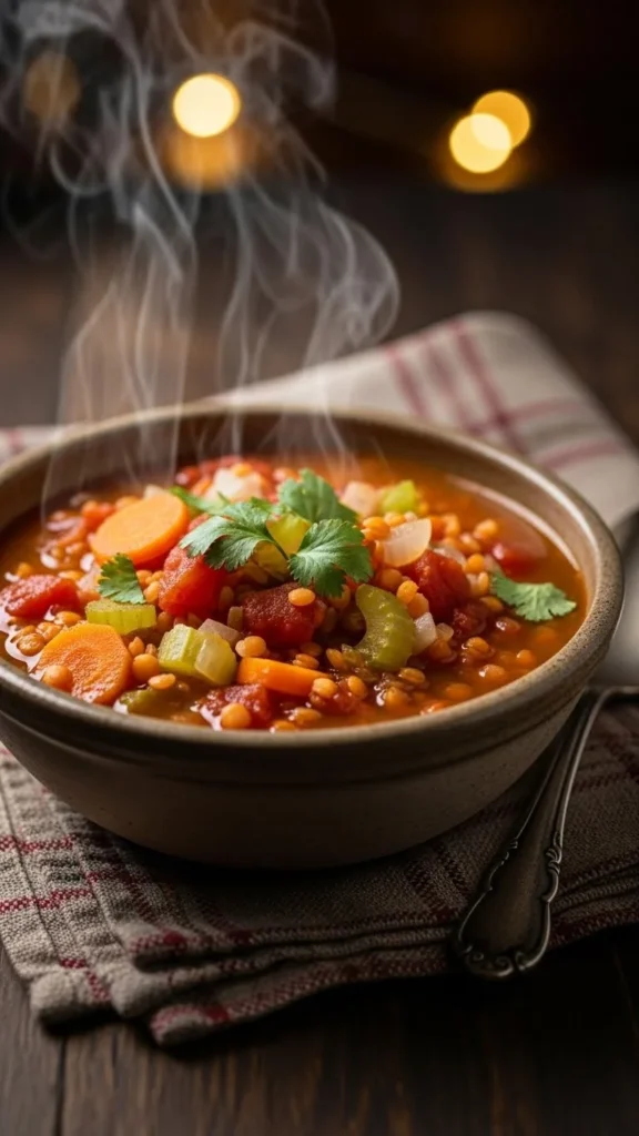 This soup becomes thick, earthy, and deeply flavorful as the lentils cook quickly in the pressure cooker. The tomatoes add warmth and brightness, and the herbs give it a cozy winter aroma. It’s nourishing and perfect for quiet nights.