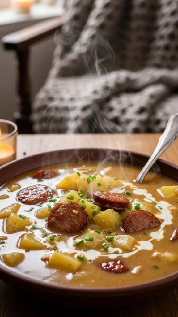 This chowder cooks into a warm, hearty bowl full of creamy broth and soft potatoes. The sausage adds rich flavor that spreads through the soup quickly. It’s ideal for busy nights when you want something filling fast.