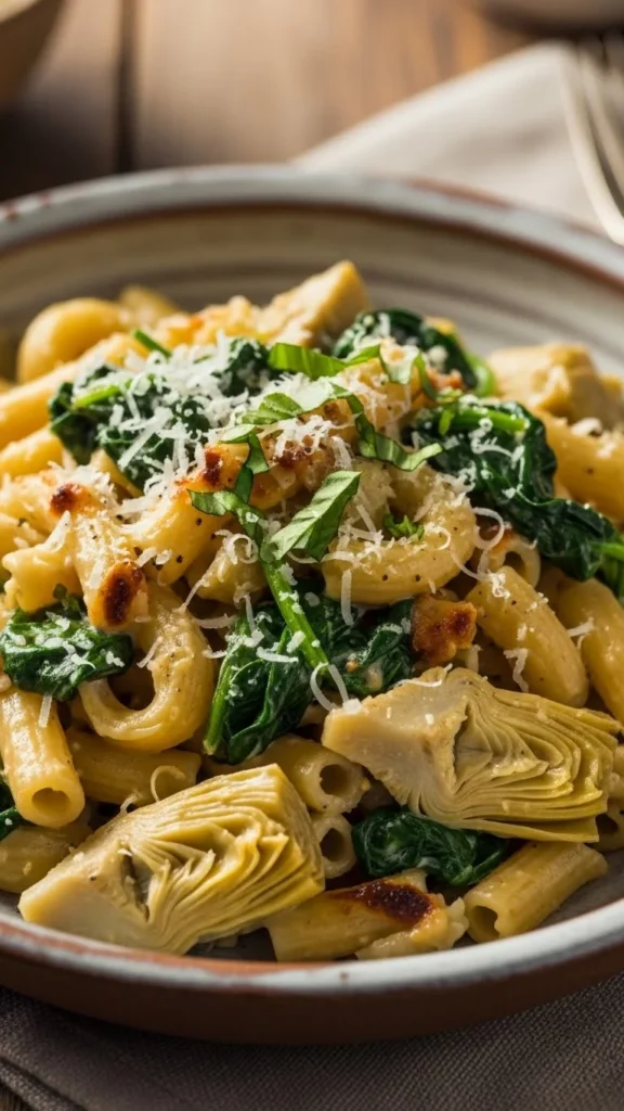 This pasta brings classic dip flavors into a rich winter skillet. The spinach and artichokes blend beautifully with the creamy sauce. It’s hearty, warm, and perfect for family meals.