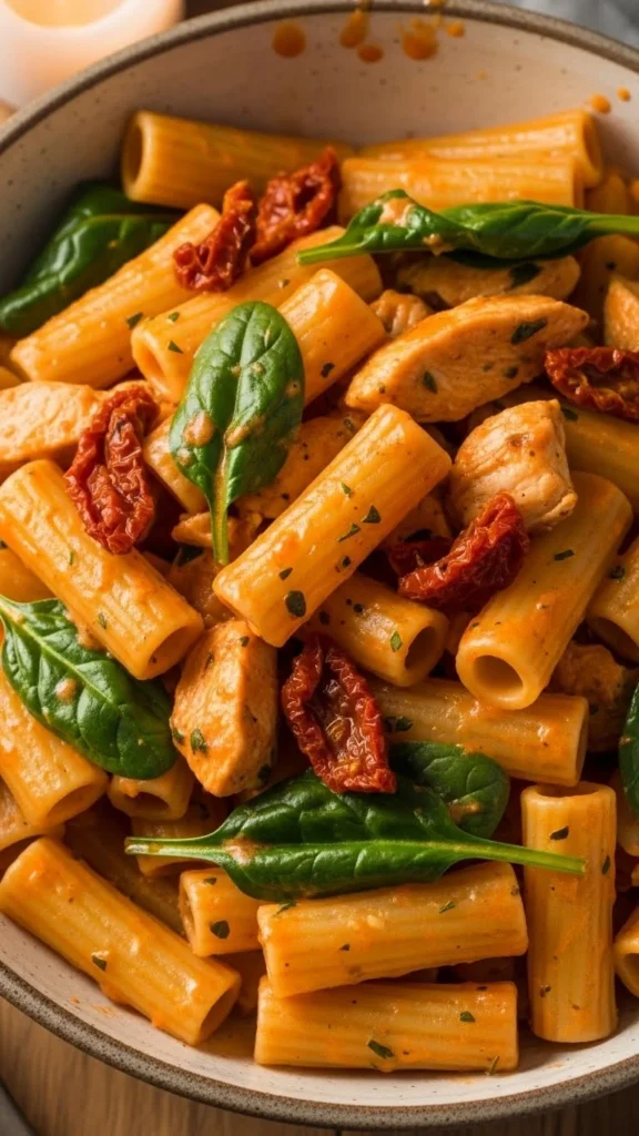 This dish combines tender chicken with a creamy sauce filled with spinach and sun-dried tomatoes. The rigatoni holds the sauce beautifully, making each bite comforting and flavorful. It’s a balanced winter pasta with rich texture and color.