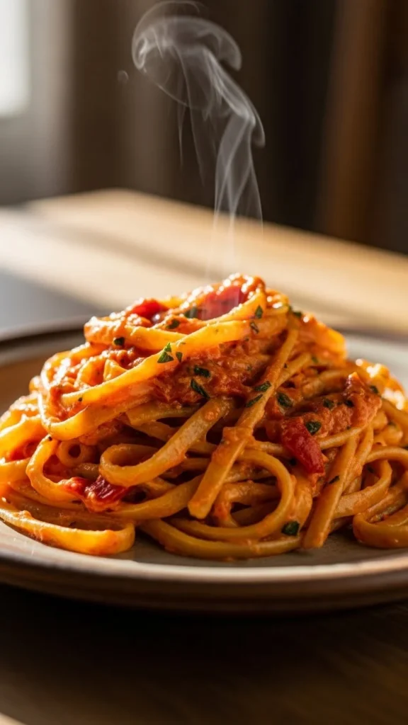 This pasta features a smooth roasted red pepper sauce blended with cream for a warm and slightly sweet flavor. The color is vibrant and perfect for winter dinners. It’s simple but feels special on the plate.