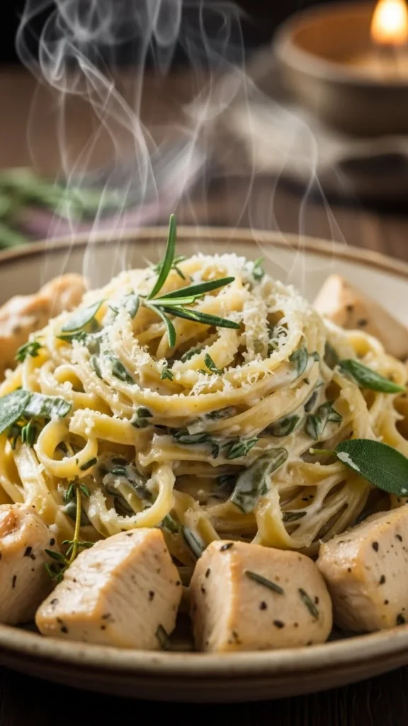 This pasta blends tender chicken with a smooth herb-infused cream sauce. The flavor is warm and cozy, perfect for chilly weather. It feels classic but still rich enough for a satisfying meal.