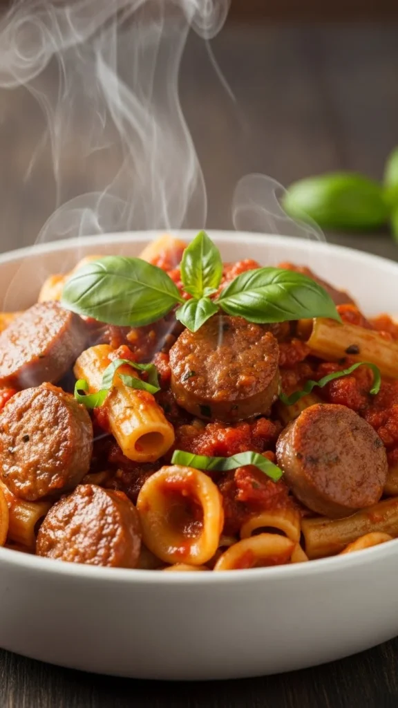 This pasta combines savory sausage with a creamy roasted tomato sauce that feels perfect for winter. The tomatoes add depth, while the cream makes everything smooth and rich. It’s a hearty bowl that cooks quickly.
