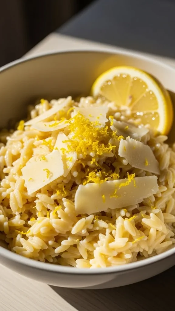 This orzo becomes smooth and silky with cream and Parmesan, while lemon adds gentle freshness. It’s warm, comforting, and still light enough for busy evenings. The texture is creamy like risotto but cooks much faster.