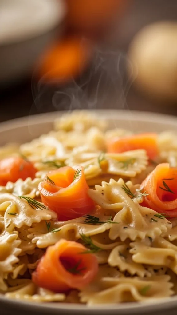 This pasta brings gentle smoky flavor from the salmon mixed into a smooth, creamy sauce. The farfalle holds the pieces well and makes each bite satisfying. It feels fancy but is very easy to prepare.