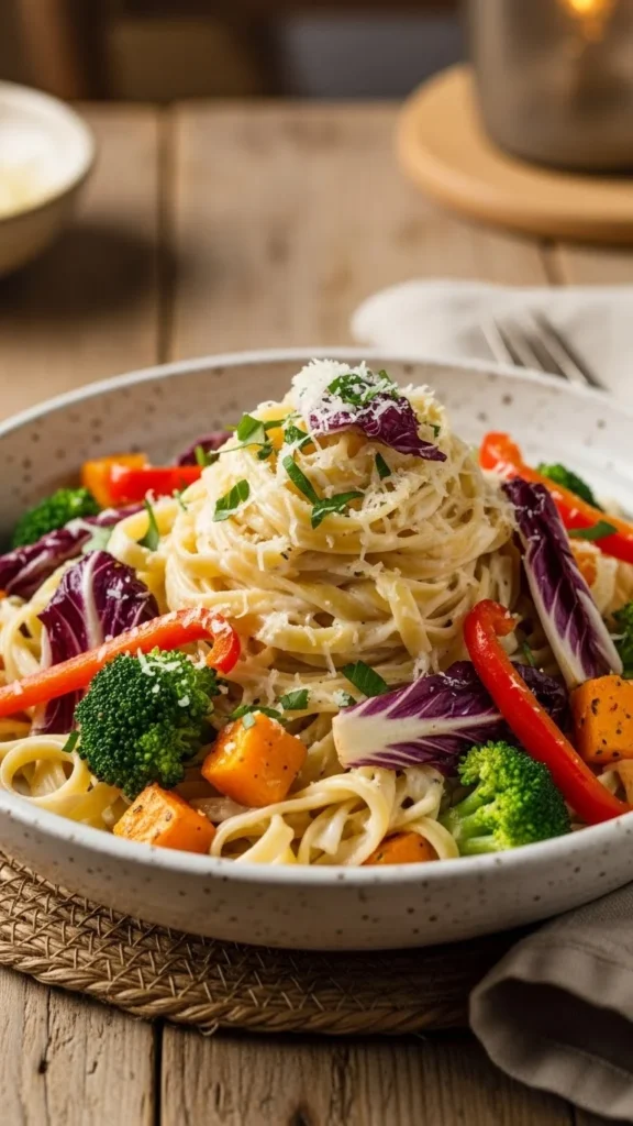 This pasta mixes classic Alfredo with roasted winter vegetables for extra warmth and texture. The sauce coats everything in a smooth, comforting layer. It’s great for using seasonal ingredients.
