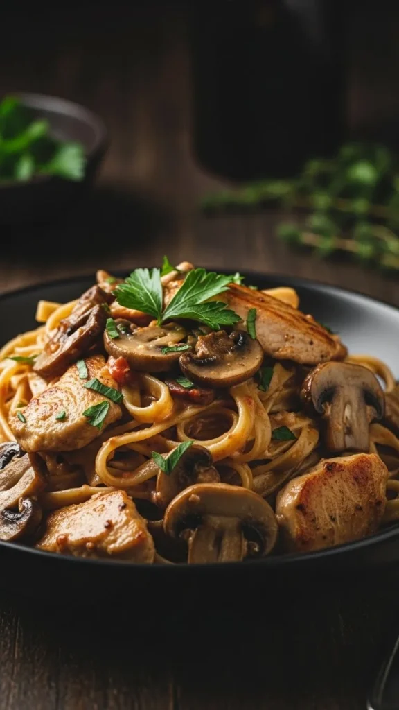 This pasta blends rich Marsala wine with cream, mushrooms, and tender chicken for a warm winter flavor. The sauce becomes silky and comforting. It’s a hearty bowl with a deep taste.