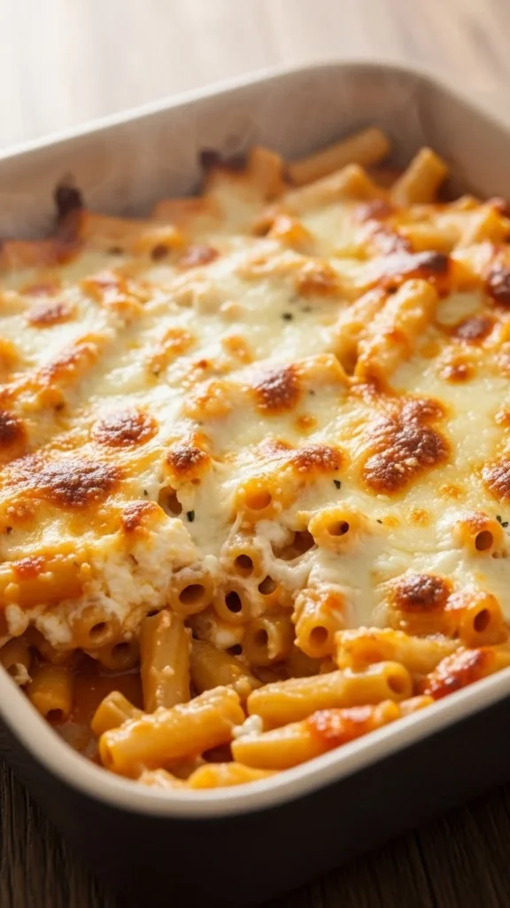 This ziti bakes into a cheesy, creamy pasta with a soft inside and golden top. The three cheeses blend into a rich sauce perfect for winter comfort. It’s filling and ideal for feeding family or guests.