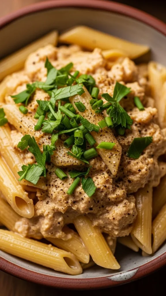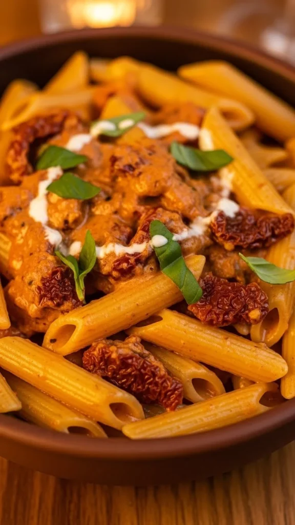 This pasta has a bold, tangy flavor thanks to the sun-dried tomatoes mixed into the creamy base. It’s warm, rich, and perfect for cold nights. The sauce clings perfectly to penne for satisfying mouthfuls.