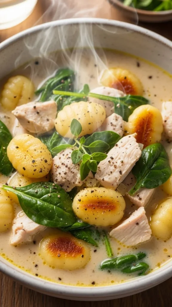 This soup mixes pillowy gnocchi with tender chicken and a creamy broth. The texture is thick and comforting, perfect for staying warm on frosty nights.
